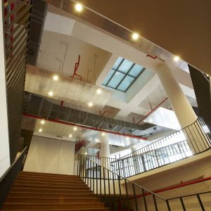 In meeting the client’’s need to allow a view corridor from the University’’s main gate to its existing classically designed 14-story building, the University’’s original 3-storey 1957 structure was partially demolished. In its place is the memory of the original building as well as a Founder’’s Quad and History Walk recalling the school’’s history. The walk is threaded as an outdoor street back to the remaining portion of the historic structure. Facing the main campus gate, a grand and monumental set of granite steps front the site’’s grade change creating a dynamic civic space for congregation or rest between classes.